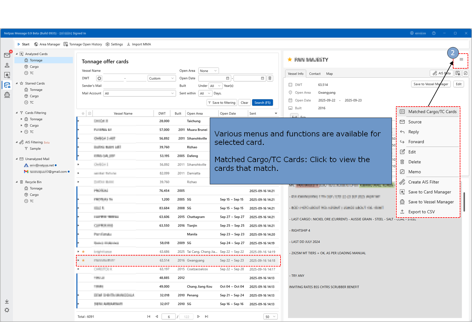 It displays matched Cargo cards for Tonnage/TC cards, and matched Tonnage/TC cards for Cargo cards automatically.