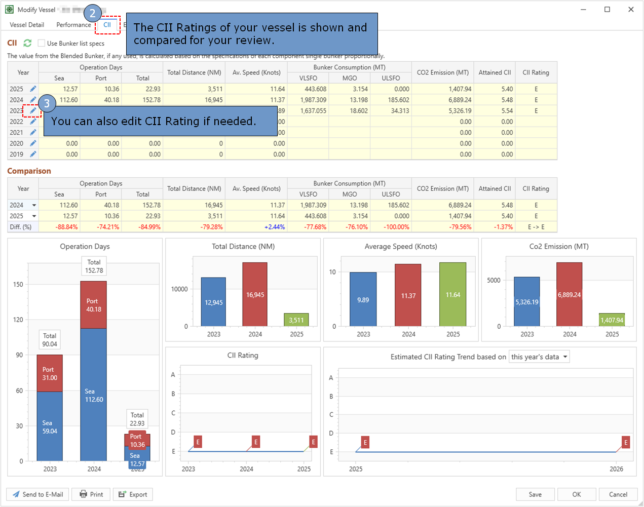 You can see your vessel’s annual CII rating (A to E) and compare its performance with other years’. You can also update and edit CII rating when needed.